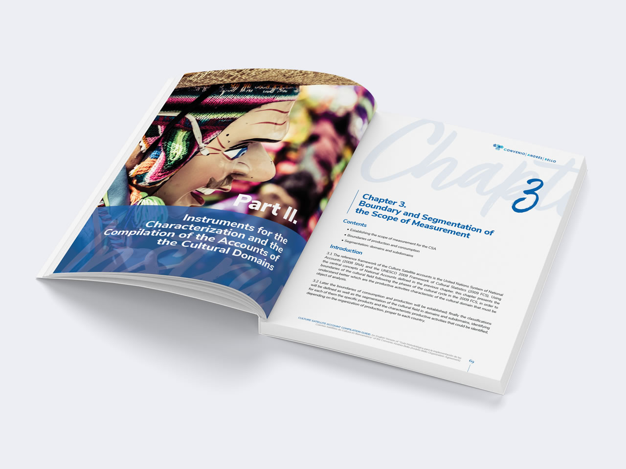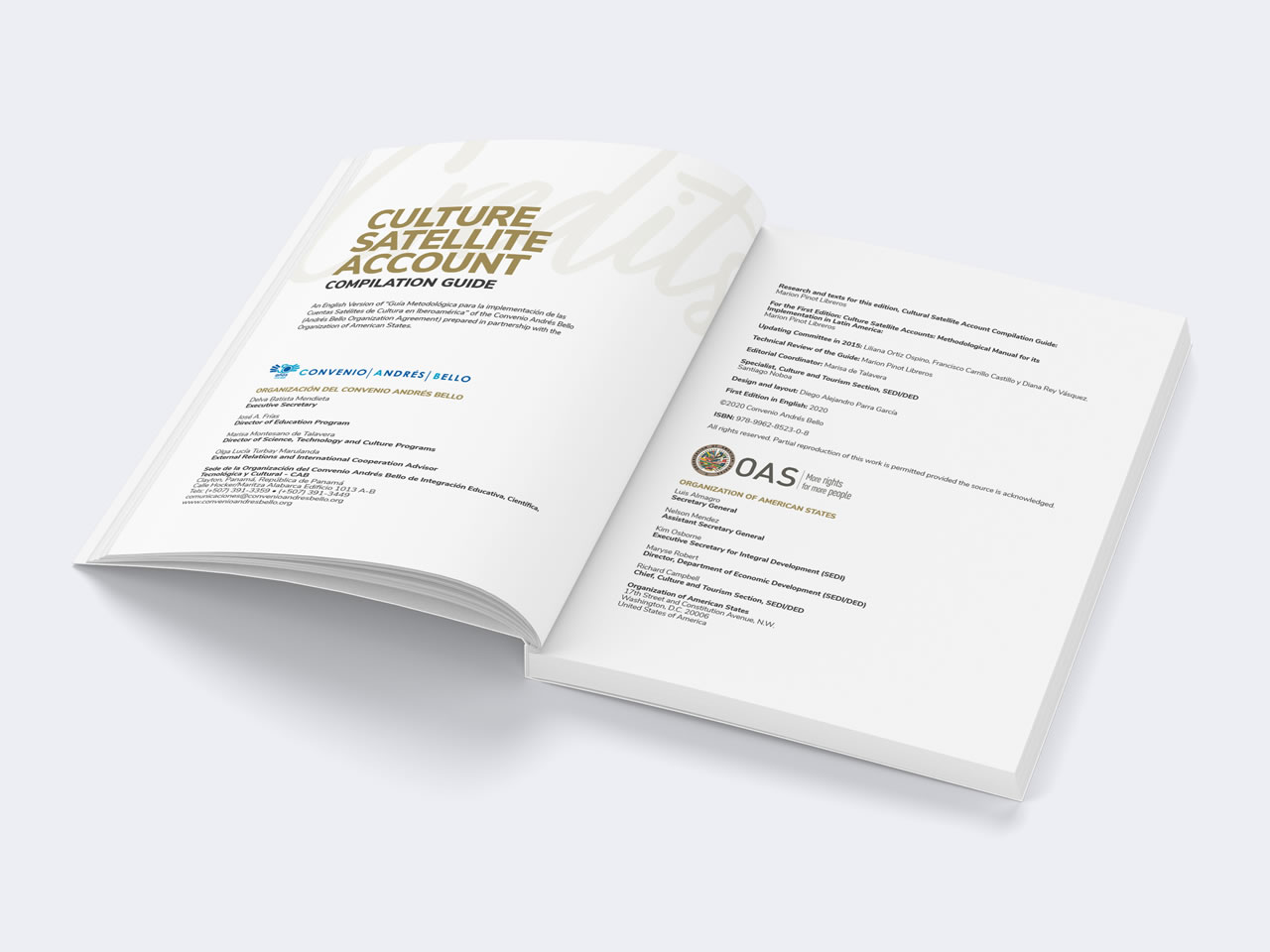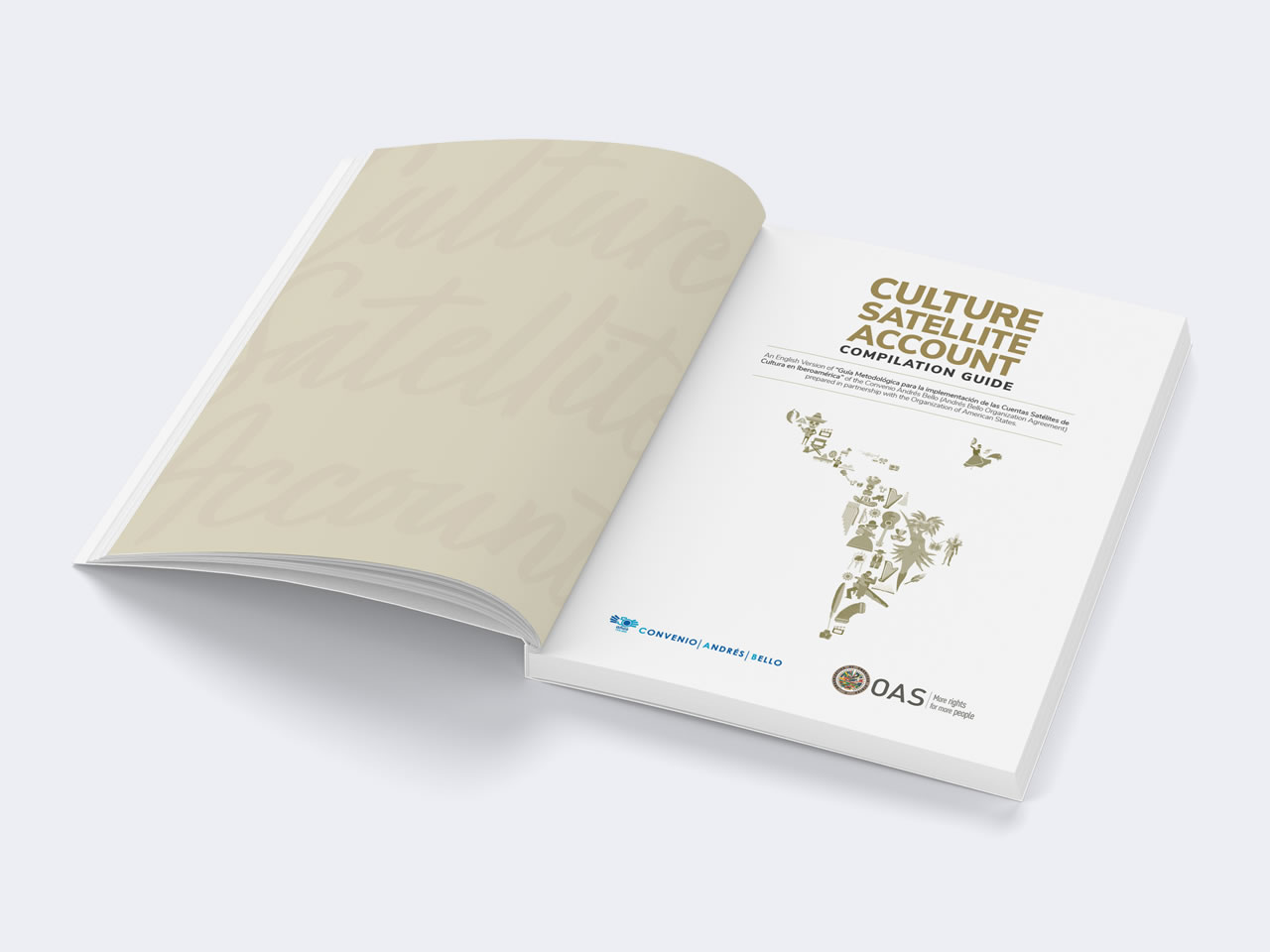 Diseño y Diagramación de la versión en inglés de la “Guía Metodológica para la implementación de las Cuentas Satélites de Cultura en Iberoamérica” de la Organización del Convenio Andrés Bello preparado en asociación con la Organización de los Estados Americanos OEA. La Organización del Convenio Andrés Bello de Integración Educativa, Científica, Tecnológica y Cultural, es un organismo intergubernamental conformado por: Bolivia, Chile, Colombia, Cuba, Ecuador, España, México, Panamá, Paraguay, Perú, República Dominicana y Venezuela.