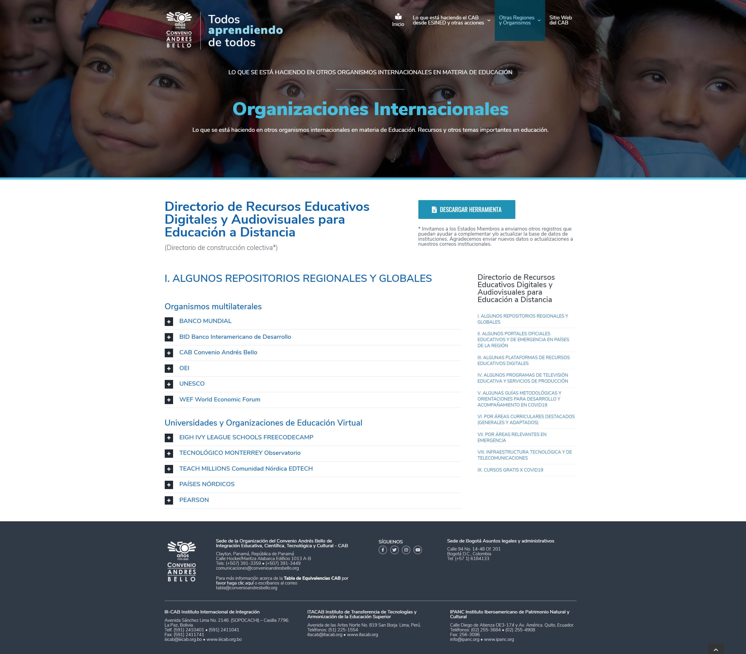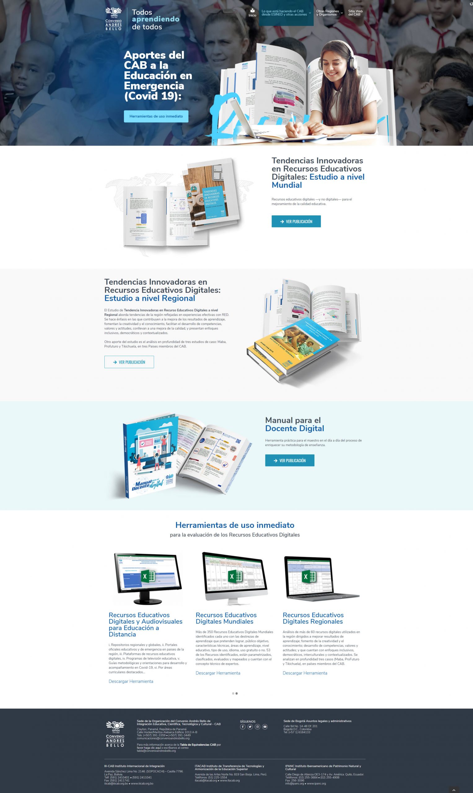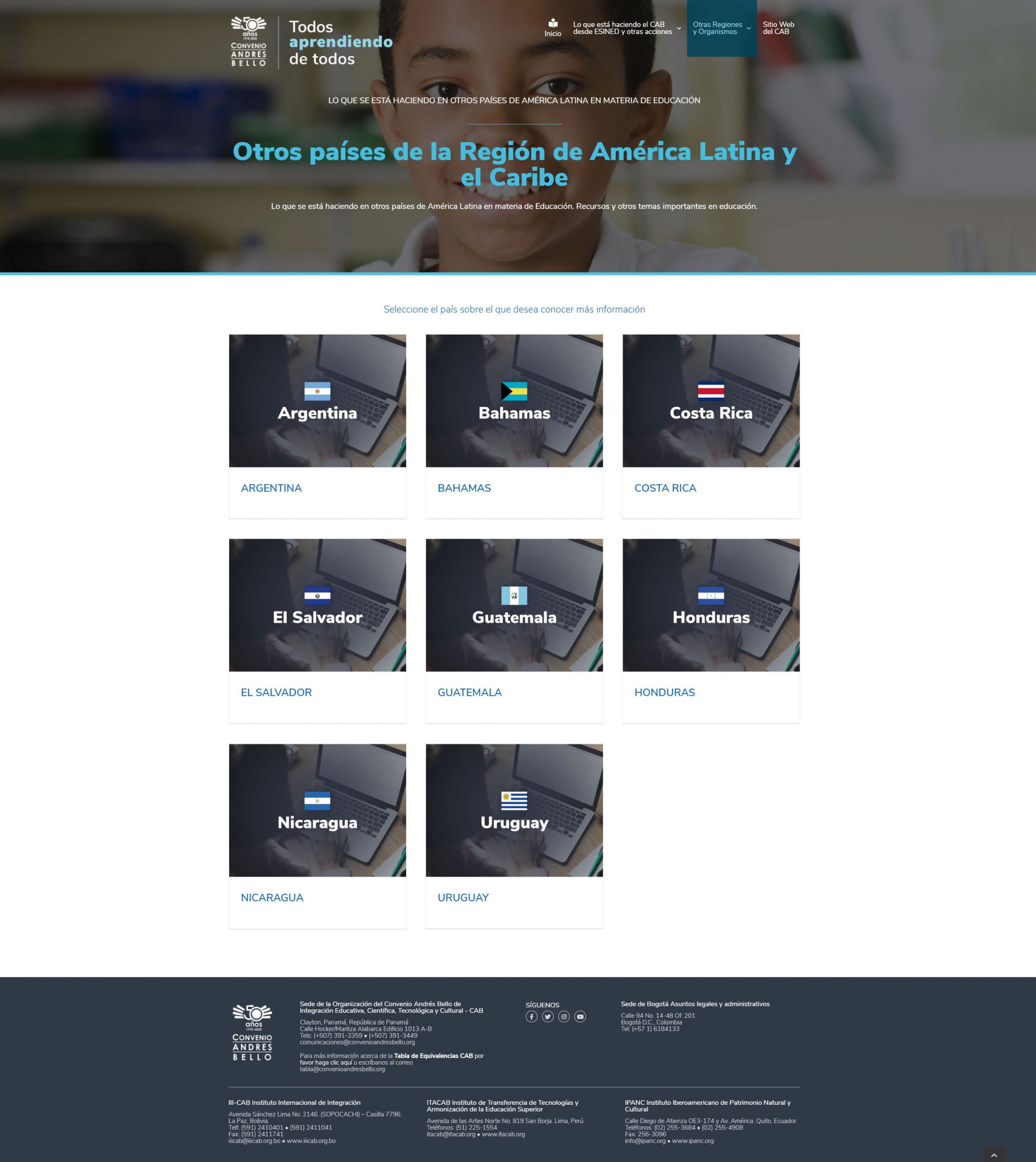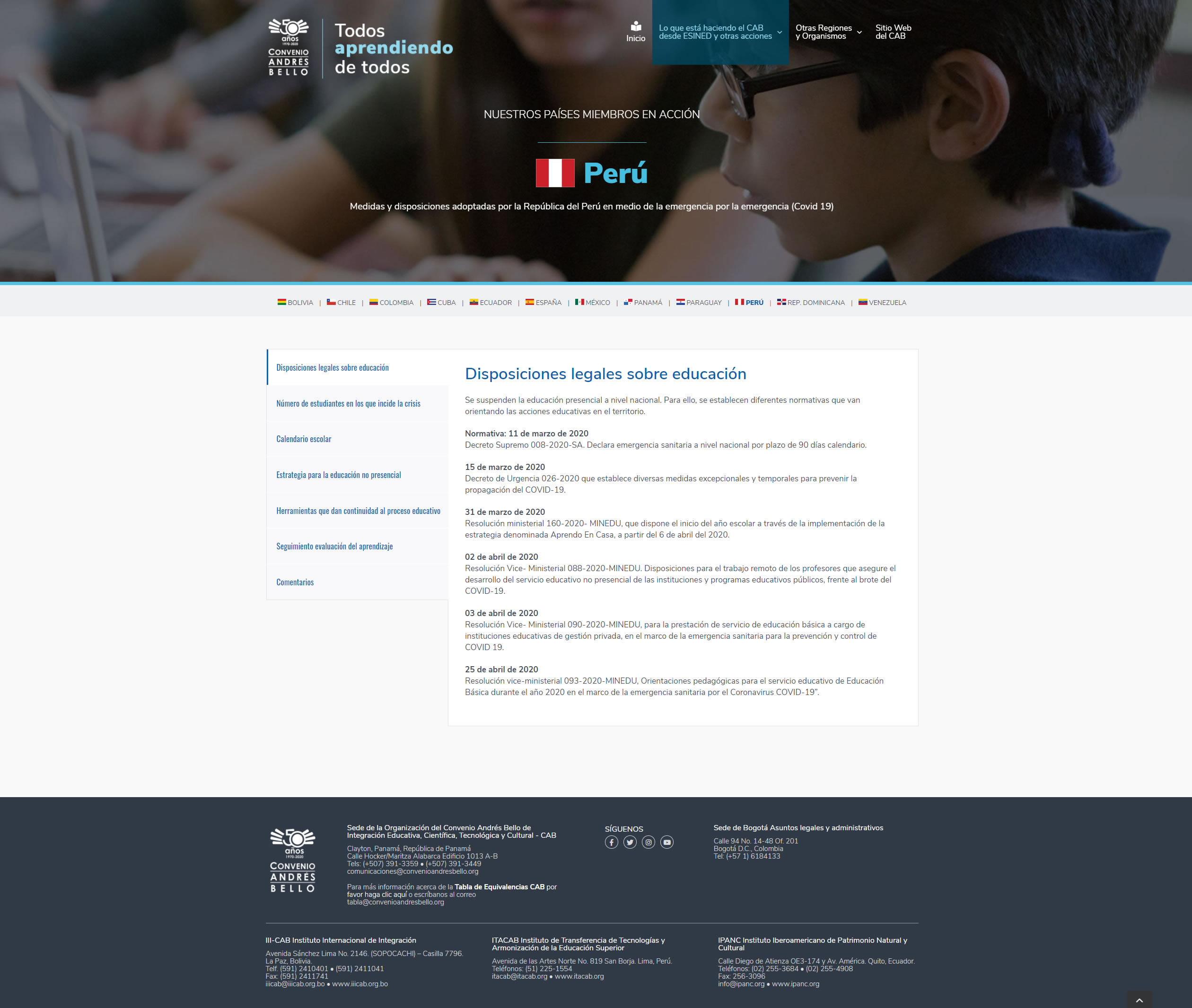 Sitio Web dinámico para el proyecto Todos aprendiendo de todos: Aportes que está realizando la Organización del Convenio Andrés Bello a la Emergencia Educativa por el Covid 19 en los países iberoamericanos. La Organización del Convenio Andrés Bello de Integración Educativa, Científica, Tecnológica y Cultural, es un organismo intergubernamental conformado por: Bolivia, Chile, Colombia, Cuba, Ecuador, España, México, Panamá, Paraguay, Perú, República Dominicana y Venezuela.