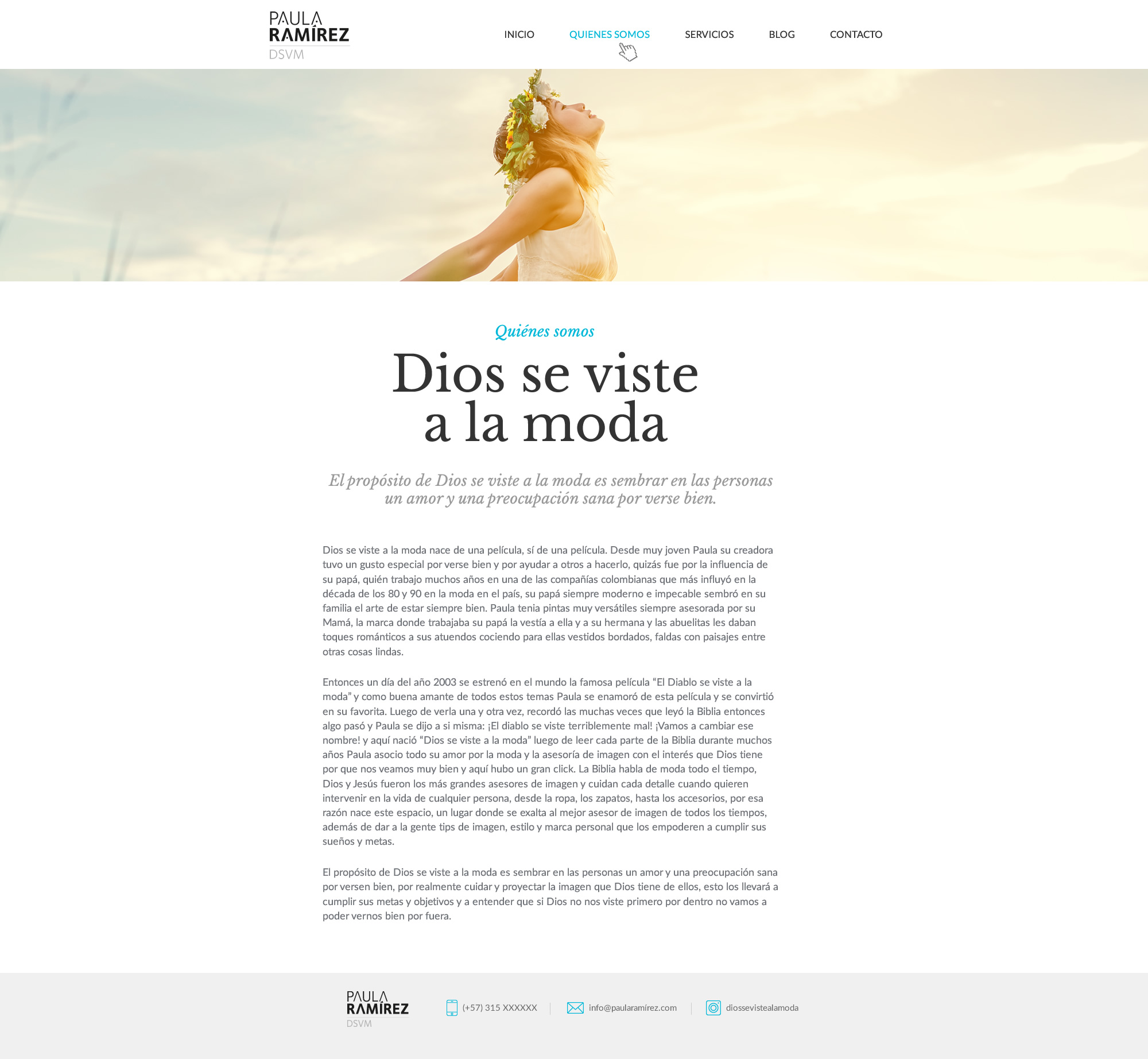 Paula Ramírez – Dios se viste a la moda nadaista2024-01-16T10:52:14-05:00Sitios Web| Sitio Web dinámico de Paula Ramírez “Dios se viste a la moda”. El propósito de Dios se viste a la moda es sembrar en las personas un amor y una preocupación sana por versen bien, por cuidar y proyectar su imagen. Visita este sitioCSS 3Desarrollo WebDiseño WebHTML 5JavascriptResponsive DesignWordpress