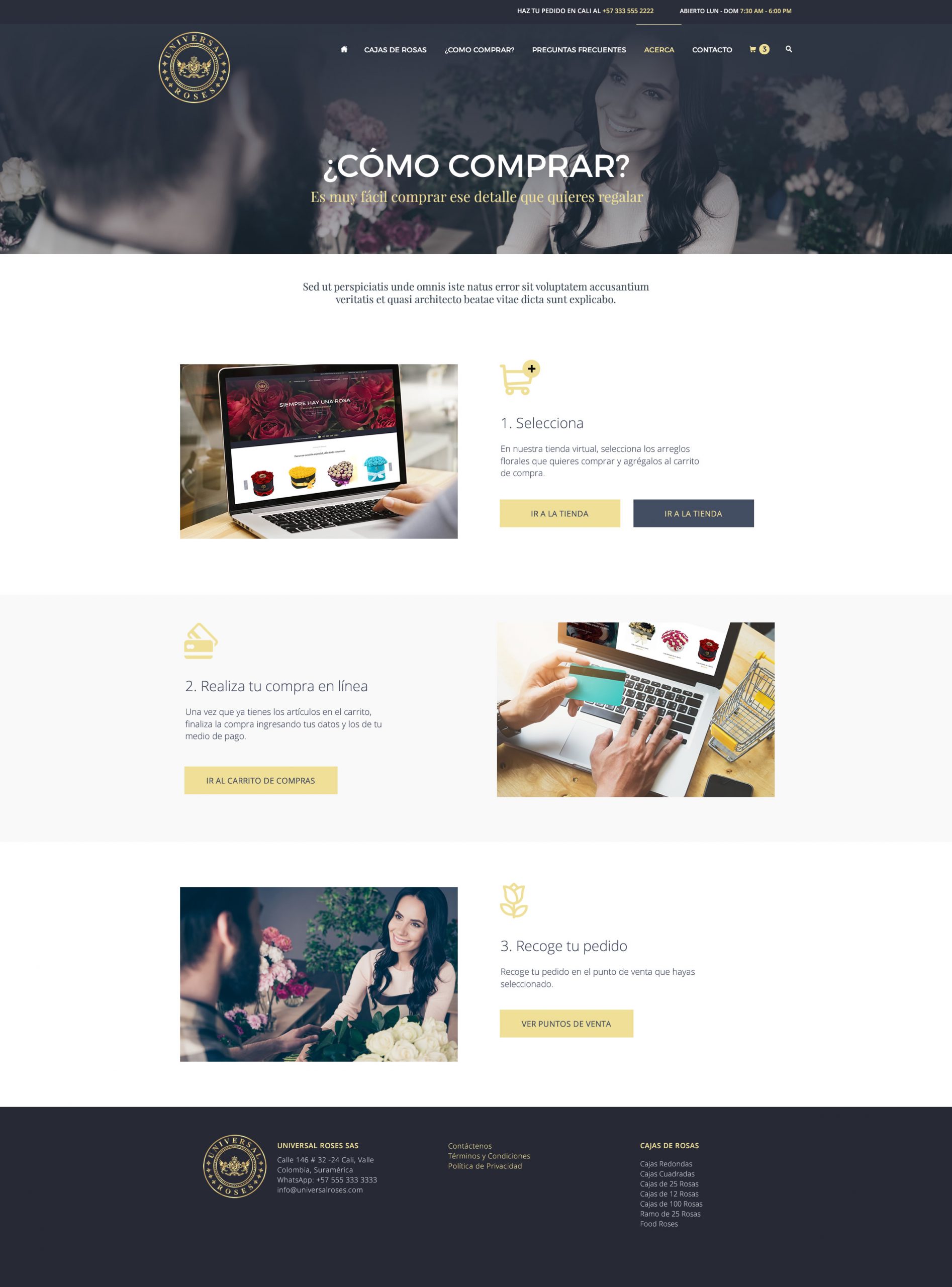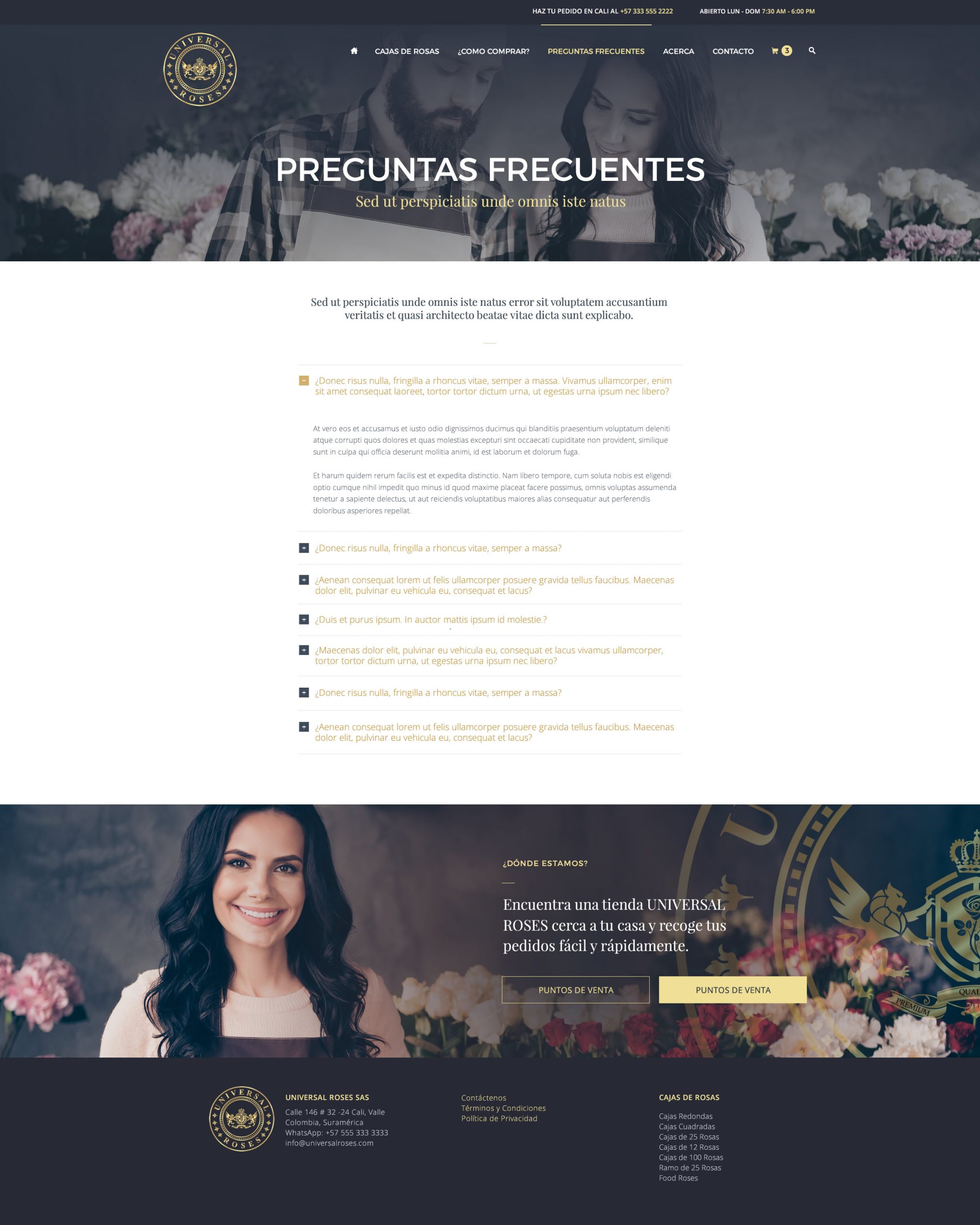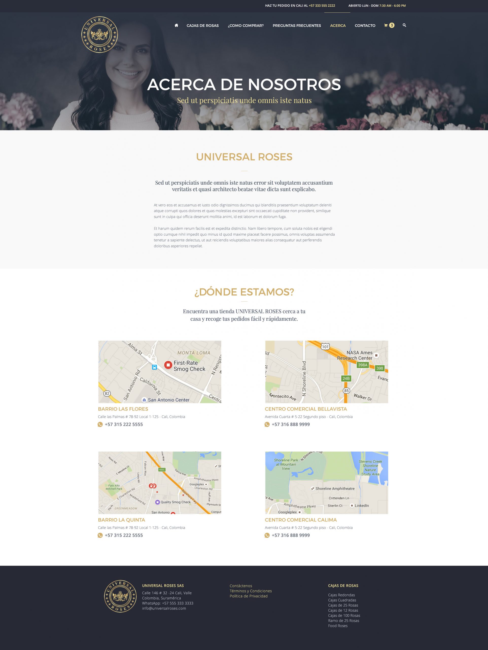 Sitio Web dinámico y Catálogo de productos para Universal Roses, boutique online en Colombia que ofrece bouquet de rosas y lirios cortados así como arreglos de rosas y cajas de alta calidad adornadas con cintas.